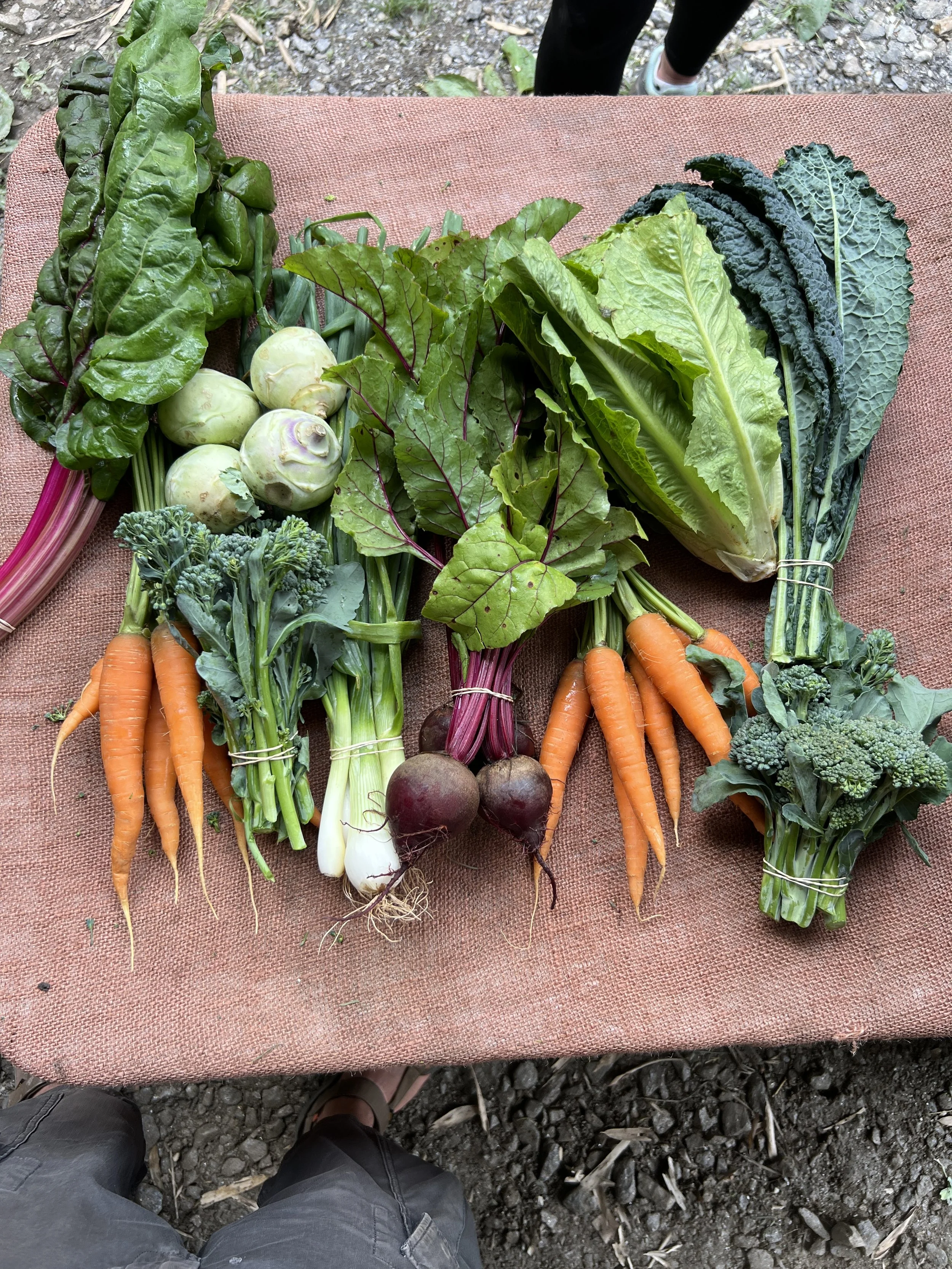 salad mix, head lettuces, carrots, radishes, turnips, squash, chard, kale, kohlrabi, sweet potatoes, cabbages, potatoes, broccoli, onions, flower bouquets, fresh herbs, and more.